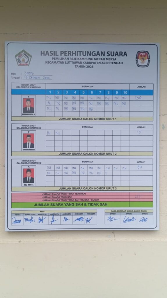 Detikgayonews.com |Takengon– Pemilihan Reje Merah Mersah di Kecamatan Lut Tawar, Kabupaten Aceh Tengah, yang berlangsung pada Sabtu, 18 Oktober 2025, berhasil ditutup dengan penentuan pemenang. Proses demokrasi di tingkat akar rumput ini berlangsung sengit dan dinanti oleh seluruh warga.