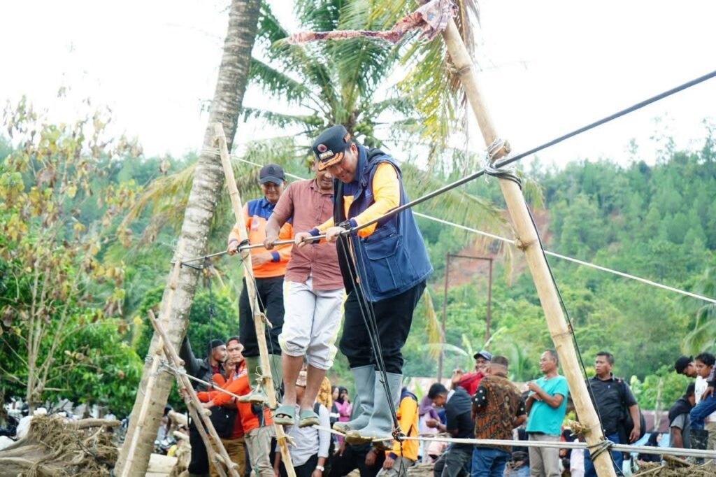 Di sejumlah titik, mobilitas masyarakat dan distribusi bantuan masih harus mengandalkan jembatan darurat menggunakan kawat sling.