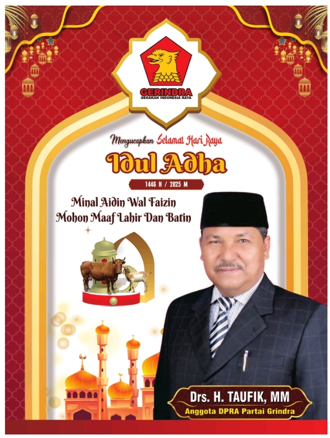 “Selamat menunaikan ibadah Hari Raya Idul Adha 1446 H kepada seluruh umat Muslim, khususnya masyarakat Aceh yang saya cintai. Semoga setiap tetesan darah hewan qurban menjadi saksi ketulusan niat dan keikhlasan hati kita di hadapan Allah Subhanahu wa Ta’ala,” ucap H. Taufik dengan penuh kelembutan.