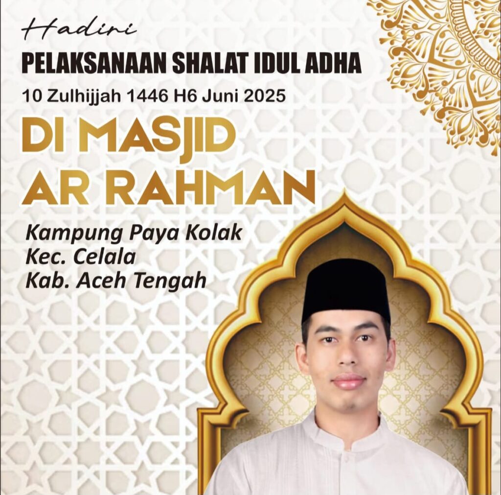 Detikgayonews.com | Takengon – Pelaksanaan shalat Idul Adha 1446 H akan digelar pada Jumat, 6 Juni 2025 M di halaman Masjid Ar-Rahmah, Kampung Paya Kolak, Kecamatan Celala, Kabupaten Aceh Tengah. Pada kesempatan ini, Ustaz Bardan Sahidi didapuk sebagai khatib.