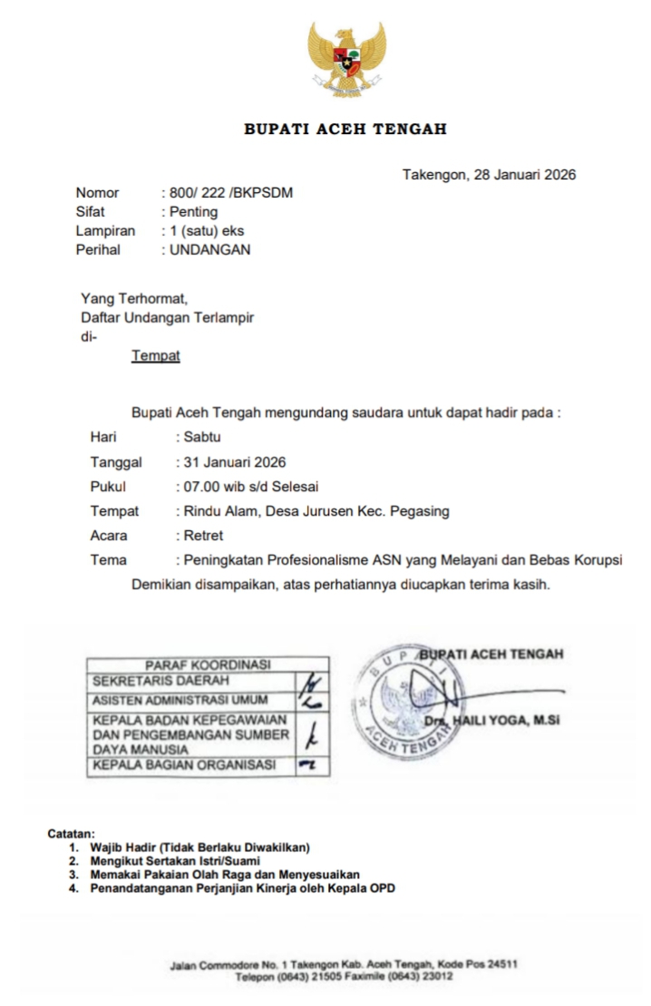 Sesuai dengan undangan yang beredar, para peserta diwajibkan hadir dan tidak boleh diwakilkan. Kegiatan itu, akan dilaksanakan di kawasan Rindu Alam, Kampung Jurusen, Kecamatan Pegasing, Sabtu 31 Januari 2026.
