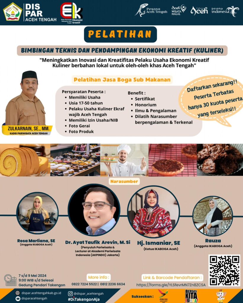 Peserta pelatihan akan diseleksi sesuai dengan persyaratan yang telah ditentukan. Pelatihan jasa boga makanan dengan kuota 30 peserta serta jasa boga minuman 15 peserta. Pelatihan jasa boga makanan dilaksanakan mulai Tanggal 7 hingga 9 Mei 2024. Dan Pelatihan jasa boga minuman mulai tanggal 10 hingga 11 Mei 2024 di Gedung Pendari, Kota Takengon.