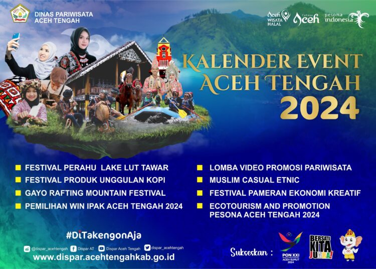 Kalender event Aceh Tengah 2024 terdiri dari Festival Perahu Lake Lut Tawar, Festival Produk Unggulan Kopi, Gayo Rafting Moutain Festival, Pemilihan Win Ipak Aceh Tengah 2024, Lomba Video Promosi Pariwisata, Muslim Casual Etnic, Festival Pameran Ekonomi Kreatif dan Ecotourism and Promotion Pesoan Aceh Tengah 2024.