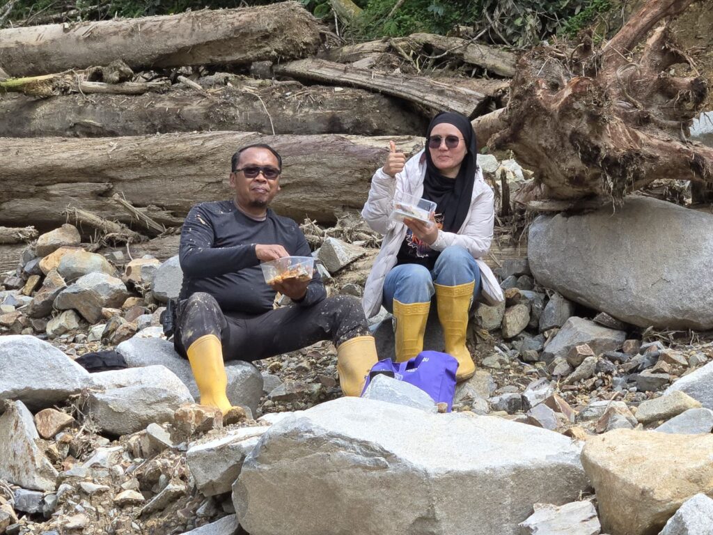 Teks Foto : Ketua DPRK Aceh Tengah, Fitriana Mugie didampingi sang suami Mugie, beristirahat sejenak di bekas lokasi banjir bandang saat mengantar bantuan ke kawasan terisolir di Kampung Serule, Kecamatan Bintang.