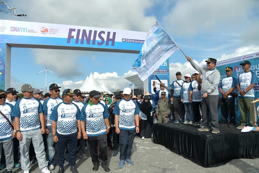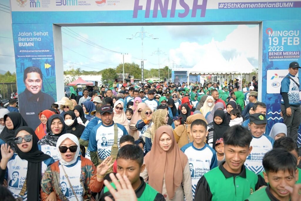 Bener Meriah – Gerak jalan sehat dalam rangka HUT ke-25 Kementerian BUMN di Kabupaten Bener Meriah, Minggu (19/2/2023) pagi, berlangsung semarak. Kegiatan olahraga ringan yang melibatkan berbagai unsur itu, dipusatkan di kawasan Pedestrian, Jalur Dua, Bandara Rembele.