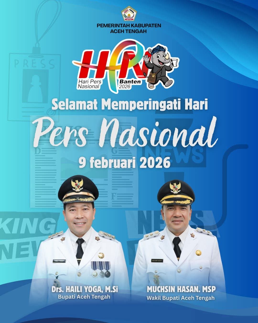 Detikgayonews.com, Takengon | Bupati Aceh Tengah Drs. Haili Yoga, M.Si bersama Wakil Bupati Aceh Tengah, Muchsin Hasan, MSP menyampaikan ucapan selamat memperingati Hari Pers Nasional (HPN) tahun 2026 kepada seluruh insan pers, khususnya yang bertugas di Kabupaten Aceh Tengah. Ucapan tersebut disertai apresiasi atas peran strategis pers dalam menyampaikan informasi yang akurat, berimbang, dan edukatif kepada masyarakat.