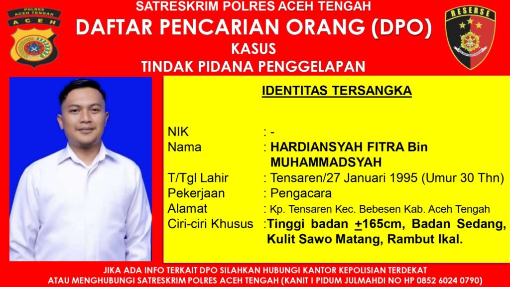 DetikGayoNews.com, Aceh Tengah – Seorang oknum pengacara di Kabupaten Aceh Tengah, Hardiansyah Fitra bin Muhammadyah, resmi masuk dalam Daftar Pencarian Orang (DPO) oleh Satuan Reserse Kriminal (Satreskrim) Polres Aceh Tengah. Pria berusia 30 tahun tersebut diburu terkait dugaan kasus tindak pidana penggelapan.