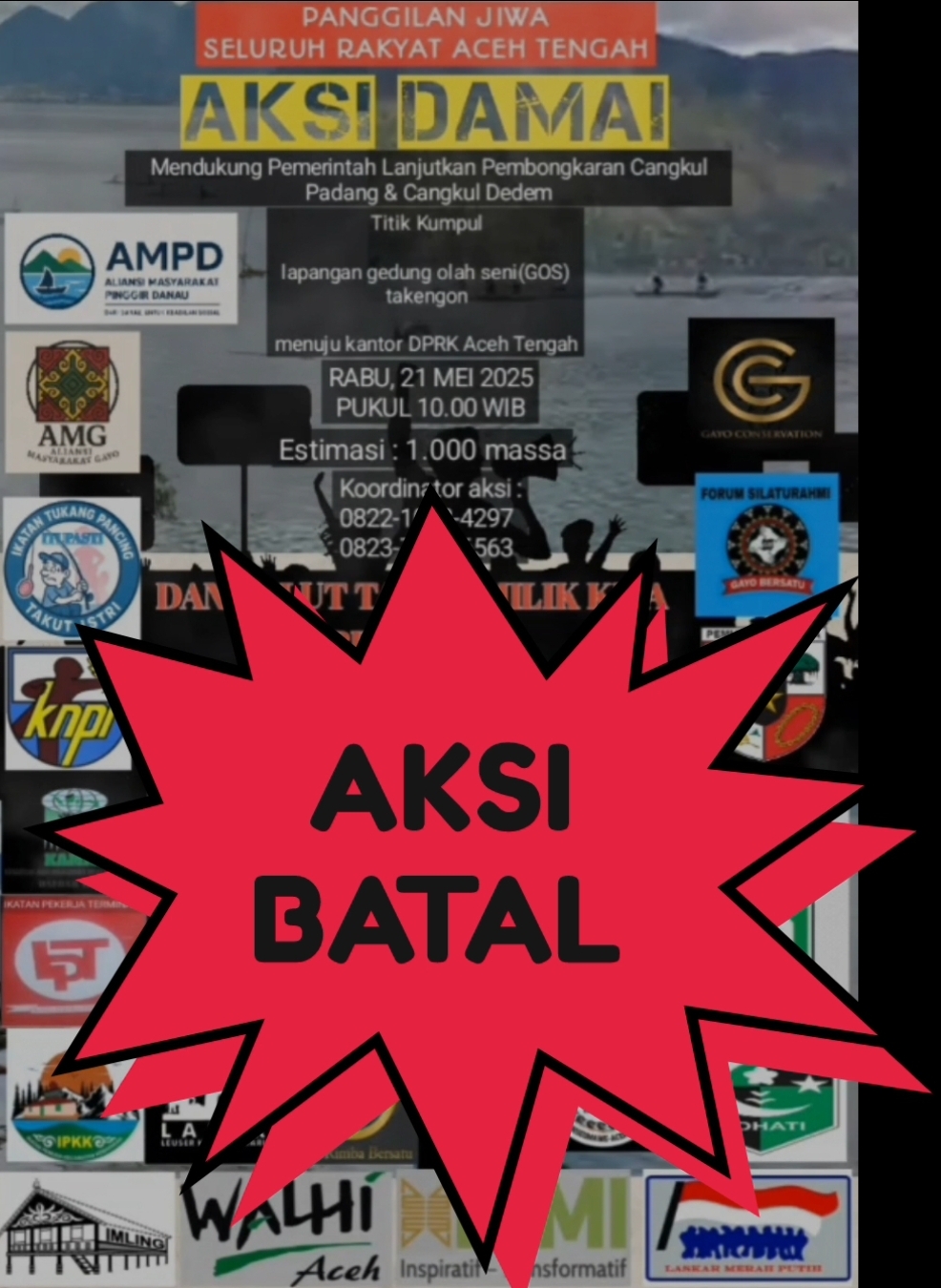 Detikgayonews.com | Takengon- Rencana ribuan masyarakat untuk turun ke jalan mendukung Pemerintah Daerah Aceh Tengah dalam kegiatan pembongkaran alat tangkap ikan jenis *cangkul padang* dan *cangkul dedem* di Danau Lut Tawar dibatalkan. Aksi yang semula direncanakan pada Rabu, 21 Mei 2025, itu dibatalkan setelah koordinator aksi menerima surat tanggapan dari Bupati Aceh Tengah, Haili Yoga.