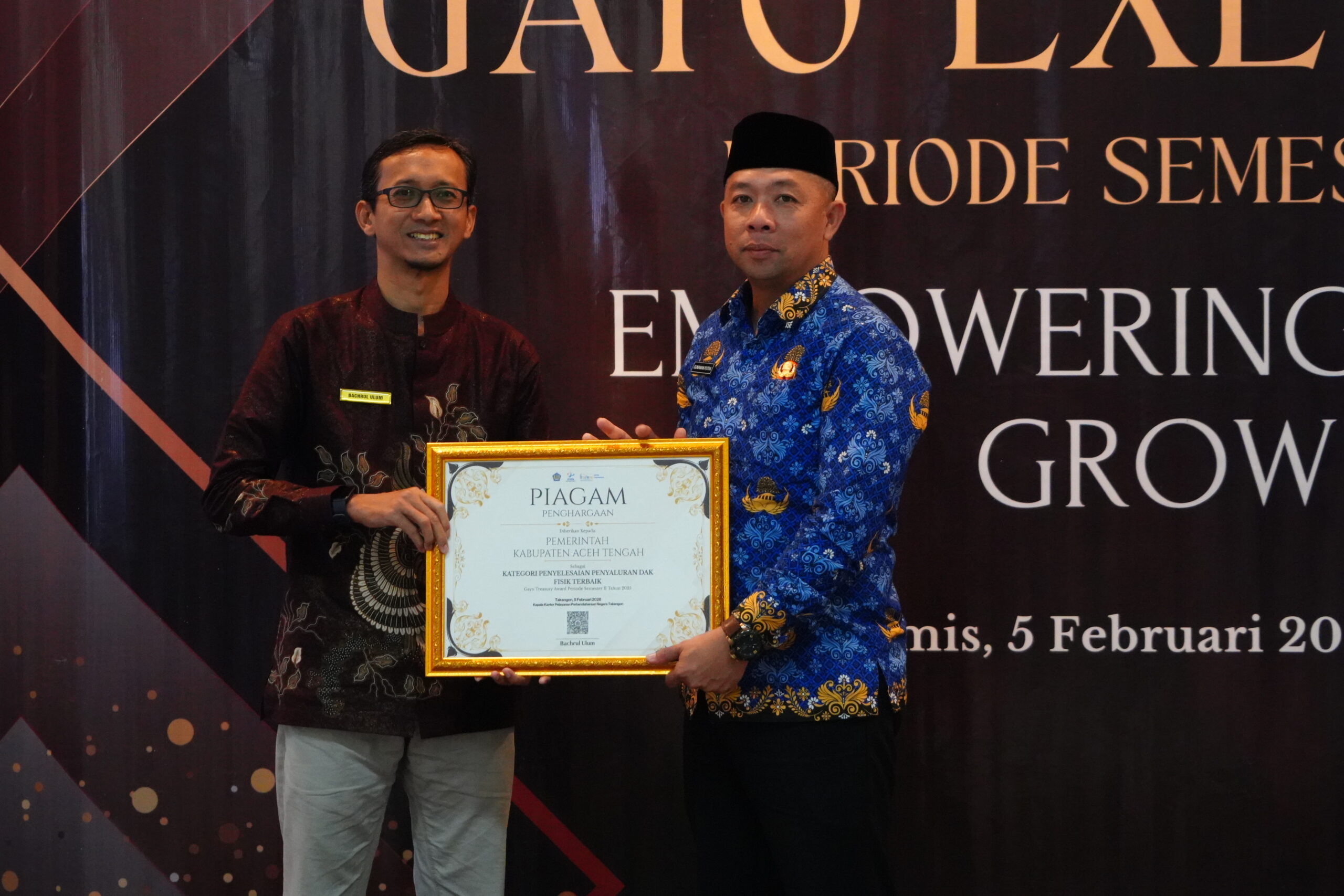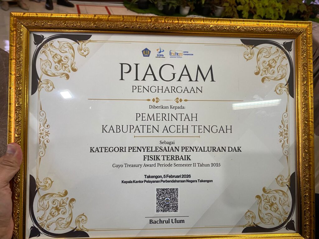 Piagam penghargaan itu, diberikan kepada Pemkab Aceh Tengah yang diterima oleh Kepala Badan Pengelola Keuangan Kabupaten (BPKK), Gunawan Putra, SE, M.Si di sela acara Gayo Treasury Award Periode Semester II Tahun 2025 yang berlangsung di Kantor KPPN Takengon, Kamis (5/2/2026).