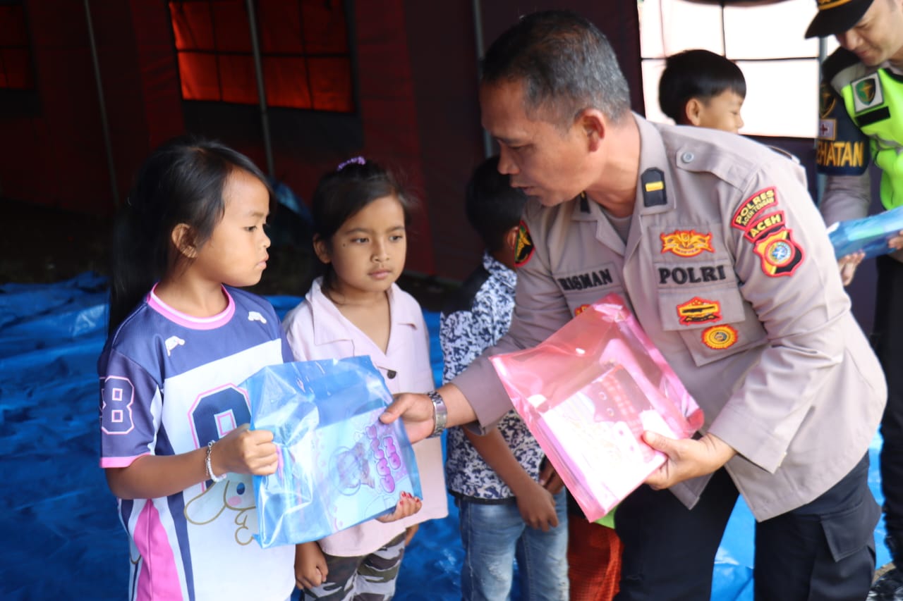 Polres Aceh Tengah Bagikan Bantuan Alat Tulis untuk Anak yang Tinggal di Posko Pengungsian