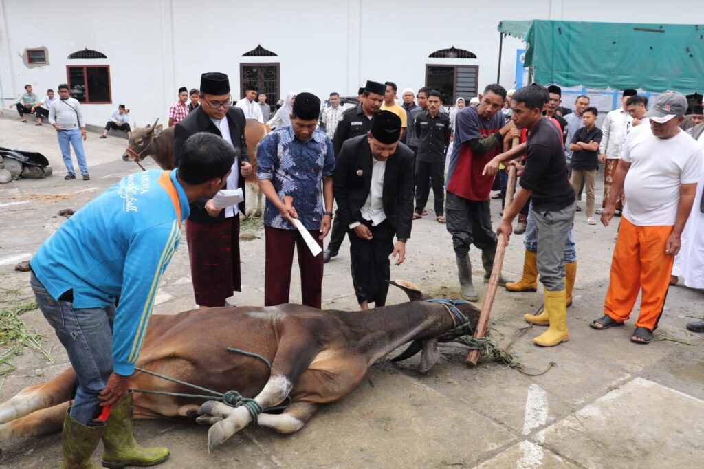 Detikgayonews.com |Takengon – Usai melaksanakan Shalat Eid Idul Adha 1445 Hijriyah di Lapangan Musara Alun Takengon, Pj. Bupati Aceh Tengah Ir. T. Mirzuan, MT bersama keluarga menyaksikan pemotongan hewan Qurban satu ekor Sapi milik keluarganya, Senin (17/6), di Masjid Raya Agung Ruhama Takengon, Kampung Merah Mersa Kecamatan Lut Tawar.