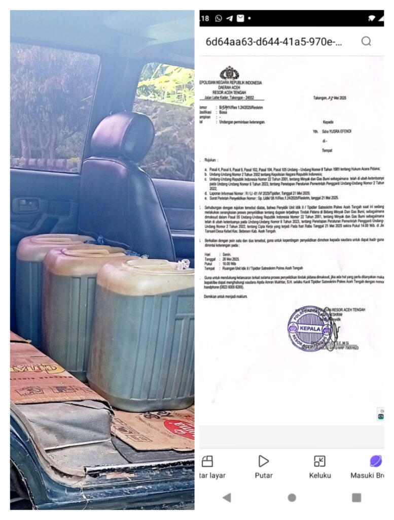 Detikgayonews.com | Takengon – Yusra Efendi, seorang wartawan media online lokal, menerima surat panggilan dari Satuan Reserse Kriminal (Satreskrim) Polres Aceh Tengah untuk dimintai keterangan terkait dugaan tindak pidana di bidang minyak dan gas bumi (migas).